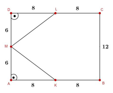 Pole pięciokąta oblicz, odejmując od pola prostokąta pola 2 identycznych trójkątów o przyprostokątnych długości 6 i 8. W razie potrzeby wykonaj rysunek pomocniczy – narysuj prostokąt i zaznacz punkty K, L, M opisane w zadaniu.