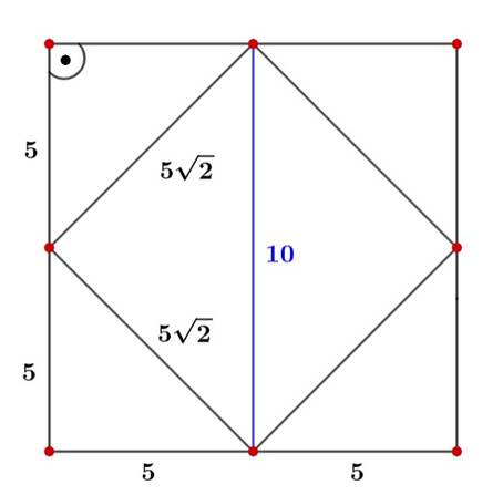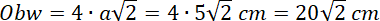 W kwadracie powstał kolejny kwadrat – jest foremny (D. prawda). Jego przekątne mają długość równą długościom boków kwadratu (C. prawda) natomiast bok to przeciwprostokątna trójkąta równoramiennego o przyprostokątnych równych 5 cm. Oblicz jego obwód: