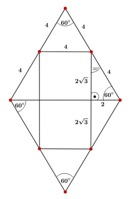 Powstała figura jest równoległobokiem, jedna para boków (przy kącie ostrym rombu) ma 4 cm, gdyż połączone punkty na środkach boków rombu tworzą trójkąt równoboczny o boku 4 cm i kącie