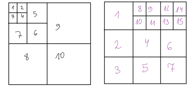 Żeby podzielić duży kwadrat na 10 mniejszych kwadratów, możesz przerysować dany rysunek, podziel tylko kwadrat ,,1” na 4 mniejsze i rysunek gotowy. Aby podzielić na 15 kwadratów, podziel duży kwadrat na 9 mniejszych kwadratów. Następnie dwa mniejsze kwadraty podziel na 4 mniejsze kwadraty.
