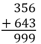 Pamiętaj, że w dodawaniu pisemnym dodajesz do siebie kolejno od prawej: jedności, dziesiątki i setki. Zatem, żeby otrzymać liczbę 999, do liczby jednostek 6 dodaj liczbę 3, do liczby dziesiątek 5 dodaj 4, a do liczby setek 3, aby otrzymać 9, dodaj 6. W ten sposób otrzymujesz 356 + 643 = 999.