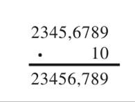 Pomnóż liczbę dziesiętną i naturalną sposobem pisemnym, czyli zapisz liczby tak jak w przypadku mnożenia pisemnego. Przecinek w wyniku przesuń jedno miejsce w prawo.