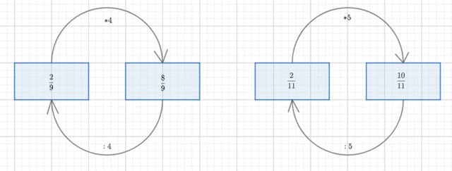Narysuj grafy i na miejsce po prawej stronie nanieś dzielną. Przy strzałce na dole napisz dzielenie, a na górze – mnożenie przez 4 (pierwszy graf) lub 5 (drugi graf). Znajdź liczbę, która po pomnożeniu przez 5 (lub 5) da liczbę po prawej, wpisz ją w miejsce po lewej.