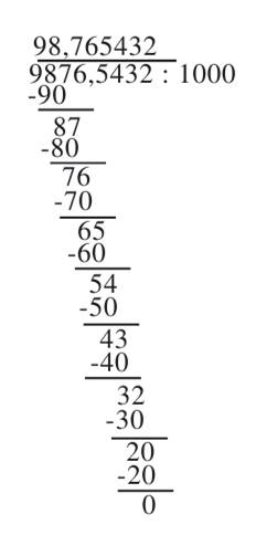Jeśli dzielisz przez liczbę dziesiętną przez liczbę typu 10, 100, 1000, itp. to musisz przesunąć tylko przecinek w lewo tyle razy, ile dana liczba ma zer.