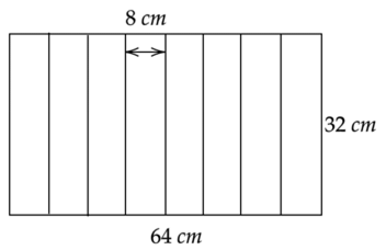 Regał ma 64 cm długości, a książka ustawiono pionowo zajmuje 8 cm. Więc na jeden półce zmieści się: 64 cm : 8 cm = 8 tomów.