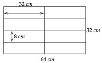 Regał ma 64 cm długości, a książka ustawiono poziomo zajmuje 32 cm. Więc na jeden półce na długość zmieści się: 64 : 32 = 2 tomy, a na wysokość: 32 : 8 = 4 tomy.