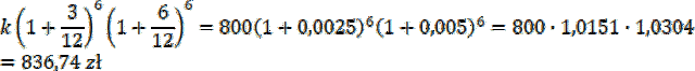 Jak wysoki będzie kapitał po roku, jeżeli wpłacono 800 zł do banku oferującego kapitalizację miesięczną. Wiadomo, że przez sześć pierwszych miesięcy roczna stopa procentowa wynosiła 3%, a przez sześć pozostałych 6%.