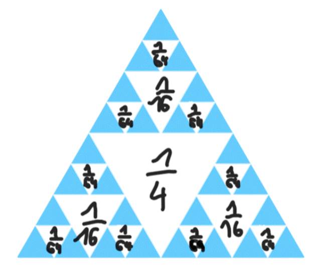 Oblicz pole ostatniej z figur przedstawionych na rysunku, jeśli pole wyjściowego trójkąta wynosi 1.