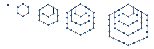 Wyznacz pięć kolejnych liczb sześciokątnych i podaj ich ilustrację graficzną.