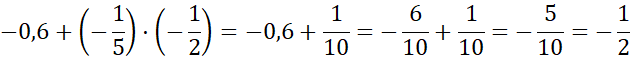 Pamiętaj, iloczyn lub iloraz liczb ujemnych jest dodatni, a liczby dodatniej i ujemnej – ujemny. Wykonaj mnożenie ułamków, a do wyniku dodaj liczbę 0,6. Skróć ułamek.