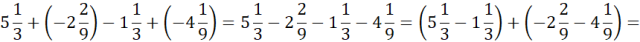Pamiętaj, dodawanie liczby ujemnej możesz zapisać jako odejmowanie liczby do niej przeciwnej. Połącz liczby o tych samych mianownikach. Na koniec wykonaj odejmowanie. Pamiętaj, żeby odjąć od większej wartości bezwzględnej wartość mniejszą i przed wynik wstawić znak liczby o większej wartości bezwzględnej.