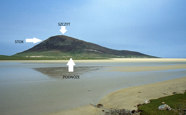 Szczyt to najwyższy punkt wzniesienia, stok to bok wzniesienia, a podnóże to podstawa wzniesienia.