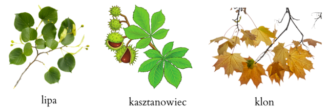 Wpisz pod ilustracjami liści nazwy drzew, na których rosną.