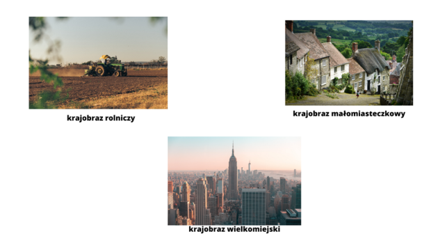 Nazwy krajobrazów pochodzą od tego, co przedstawiają. Krajobraz rolniczy przedstawia pole uprawne i narzędzia służące do uprawy roślin, natomiast krajobraz wielkomiejski ukazuje bloki, domy, fabryki, kina, hotele. Krajobraz małomiasteczkowy przedstawia małą zabudowę, niewielkie miasteczko.