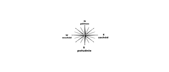 – South (Południe), N – North (Północ), E – East (Wschód), W – West (Zachód). Występują również kierunki pośrednie: (NE) północny wschód, (SE) południowy wschód, (SW) południowy zachód, (NW) północny zachód.