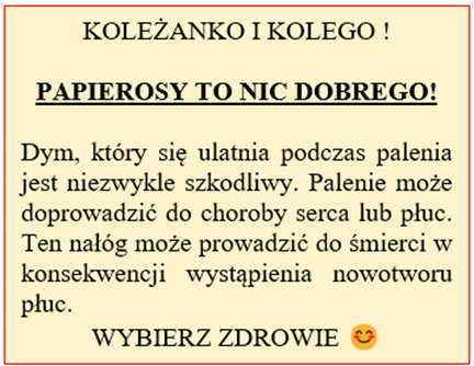 Plakat ostrzegawczy powinien zawierać: zwrot do odbiorów plakatu, hasło przewodnie nawołujące do nie używania nikotyny, krótką informację o konsekwencjach palenia papierosów, grafikę, motywację do zdrowego stylu życia.