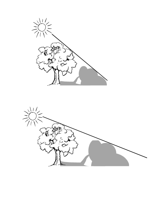 Cienie latem są krótsze, ponieważ Słońce znajduje się najwyżej nad widnokręgiem. Zimą są dłuższe, ponieważ wtedy Słońce jest nisko.
