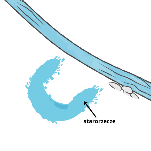 Starorzecze będzie znajdować się po lewej stronie na rysunku, jest w kształcie półksiężyca. Z kolei rzeka będzie przepływać równolegle w prostym strumieniu.