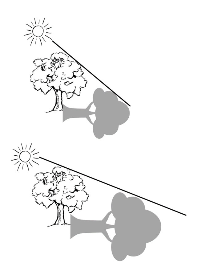 Cień drzewa w południe (górny rysunek) i po wchodzie lub przed zachodem słońca (dolny rysunek):