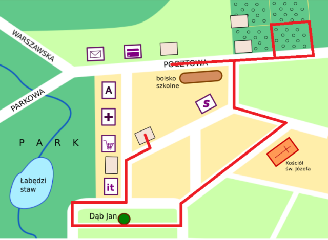 Dziewczynka musiała minąć sad, punkt informacji turystycznej, łąkę oraz Dąb Jan, a następnie wrócić do domu. Skoro wycieczce przewodził tata Hani, to najpewniej rozpoczęła się ona w pod domem Hani, choć nie jest to wskazane w treści zadania wprost.