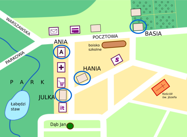 Basia mieszka przy sadzie i jednocześnie sąsiaduje z domem Ewy, który jest obok banku. Tylko jeden dom spełnia oba warunki.