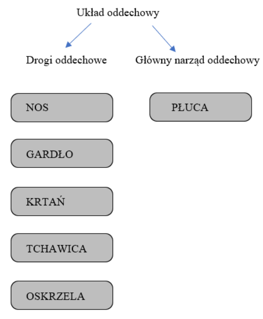 Uzupełnij schemat układu oddechowego, wpisując w odpowiednie pola nazwy narządów w odpowiedniej kolejności (od góry najbardziej zewnętrzne elementy).