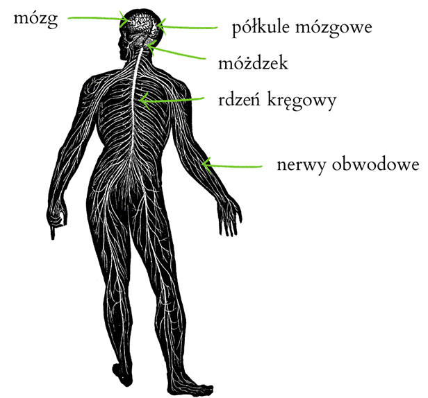 Nerwy łączą mózg i rdzeń kręgowy z resztą ciała. Biegną do narządów zmysłów, skóry oraz narządów wewnętrznych. Mają za zadanie odbierać od nich informacje i przekazywać je do odpowiednich ośrodków w mózgu, w których będą analizowane, w konsekwencji mózg przekaże informację jak organizm powinien zareagować.