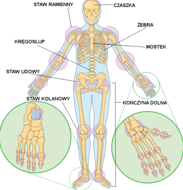 Każda kość ma swoją nazwę. Tak samo, jak każdy staw. W układzie szkieletowym możesz wydzielić szkielet osiowy (czaszkę, kręgosłup, mostek i żebra) oraz obręcz barkową (kończyny górne wraz z łopatkami) i obręcz miedniczną (kończyny dolne i miednica). Główne stawy kończyny górnej to staw ramienny, łokciowy, nadgarstkowy i stawy palców, główne stawy kończyny dolnej to staw biodrowy, kolanowy, skokowy oraz stawy palców. W ciele człowieka występuje jeszcze kilka innych stawów, na przykład stawy międzykręgowe, czy staw barkowo-obojczykowy.