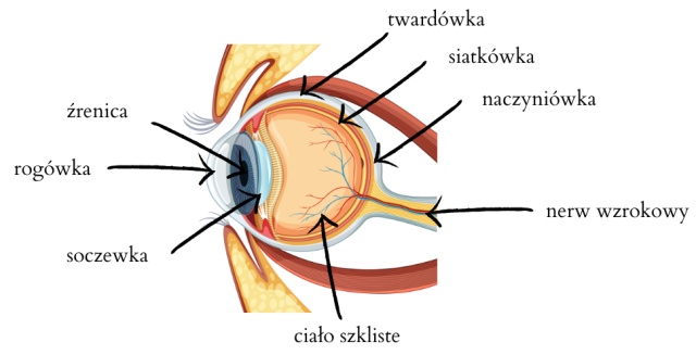 Oko to bardzo delikatny narząd. Aby go chronić, posiadasz powieki (odcinają dostęp światła i ciał stałych) oraz brwi i rzęsy (znacząco utrudniają kroplom potu, pyłkom i ciałom obcym dostanie się do oka). Źrenica, czyli otwór w tęczówce (kolorowej tarczce oka), reguluje, ile światła pada na siatkówkę (znajduje się ona wewnątrz oka i odpowiada za to, że widzimy kształty i kolory), rogówka zaś załamuje przechodzące przez nią światło, mocno je skupiając.