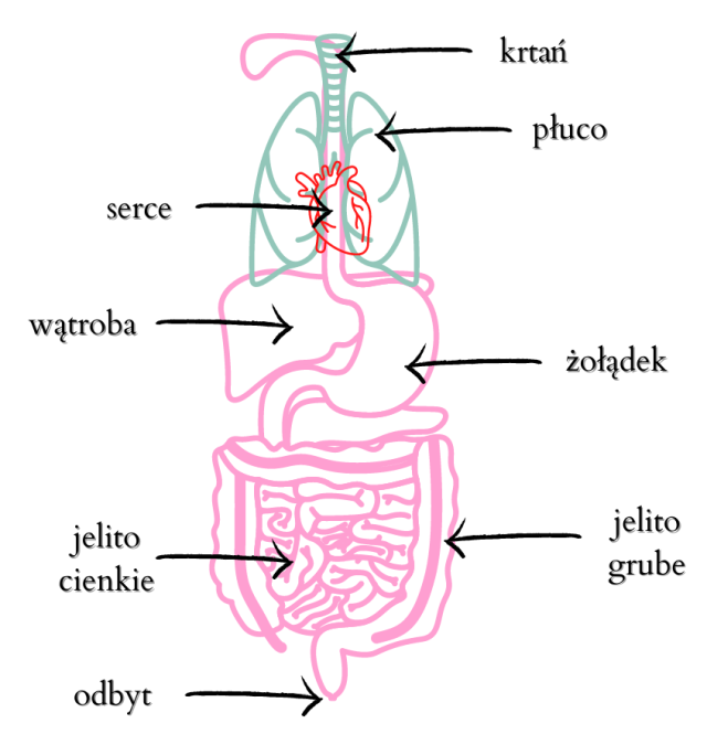 Serce (układ krwionośny), wątroba (układ pokarmowy), jelito cienkie (układ pokarmowy), odbyt (układ pokarmowy)