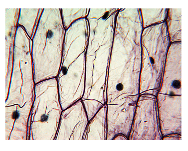 Pod mikroskopem możesz dostrzec komórki skórki liścia cebuli. Czarna kropka we wnętrzu każdej komórki, to jądro komórkowe.