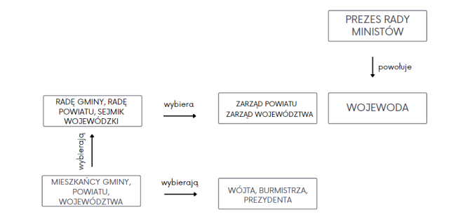 Schemat przedstawia zależności między , obywatelami a poszczególnymi organami samorządu terytorialnego oraz organami administracji rządowej.
