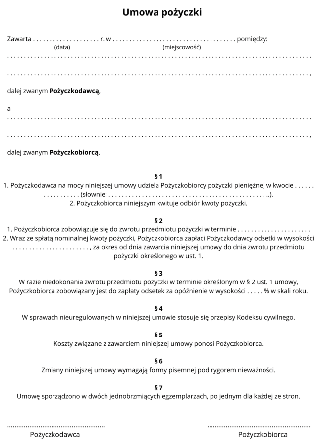 Niestety nie możemy pomóc Ci w tym zadaniu – wymaga ono Twojej samodzielnej pracy. Mamy nadzieję, że pomoże Ci dołączony przez nas wzór umowy pożyczki. Powodzenia!