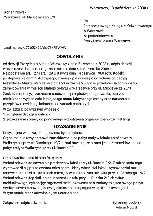 Zrozumienie decyzji administracyjnej: Pierwszym krokiem jest dokładne zrozumienie decyzji administracyjnej, od której chcesz się odwołać. Przeczytaj ją uważnie i zidentyfikuj podstawy, na których opiera się ta decyzja oraz argumenty, które zostały w niej przedstawione.Badanie przepisów prawnych: Przeanalizuj przepisy prawne, które mają zastosowanie do twojego przypadku. Sprawdź, czy organ administracyjny działał zgodnie z prawem i czy prawidłowo zastosował przepisy przy podejmowaniu decyzji. Zidentyfikuj ewentualne naruszenia przepisów lub błędy proceduralne.Zebranie dowodów: Jeśli masz dostęp do dodatkowych dokumentów, dowodów lub informacji, które mogą mieć znaczenie dla twojego odwołania, upewnij się, że gromadzisz je w celu wsparcia swoich argumentów. Mogą to być na przykład świadectwa, umowy, raporty ekspertów lub inne dokumenty, które mogą potwierdzać twoje twierdzenia.Sporządzenie odwołania: Przejdź do sporządzenia odwołania, które będzie formalnym dokumentem skierowanym do organu administracyjnego. Odwołanie powinno zawierać następujące elementy:Nagłówek zawierający dane organu administracyjnego, do którego składasz odwołanie, oraz twoje dane osobowe lub dane organizacji.Wstęp, w którym jasno zaznaczasz, że składasz odwołanie od decyzji administracyjnej i wskazujesz jej datę.Szczegółowe uzasadnienie odwołania, w którym przedstawiasz argumenty i fakty, które przemawiają za zmianą lub uchyleniem decyzji. Powinno się odnosić do konkretnych naruszeń prawa lub błędów popełnionych przez organ administracyjny.Odniesienie się do przepisów prawnych, które mają zastosowanie do twojego przypadku i które organ administracyjny miał obowiązek uwzględnić przy podejmowaniu decyzji.Dołączenie dowodów, które posiadasz, aby poprzeć swoje twierdzenia.Podpisanie odwołania i podanie daty.Składanie odwołania: Złożenie odwołania powinno odbywać się zgodnie z procedurami określonymi przez organ administracyjny. Sprawdź, jakie są wymagane terminy i sposób składania odwołania. Możesz musieć dostarczyć odwołanie osobiście, przesłać je pocztą lub skorzystać z elektronicznego systemu składania odwołania, jeśli jest dostępny.Monitorowanie postępu: Po złożeniu odwołania, warto śledzić jego postęp. Upewnij się, że masz kopię złożonego odwołania i monitoruj terminy odpowiedzi i rozpatrzenia sprawy przez organ administracyjny.
